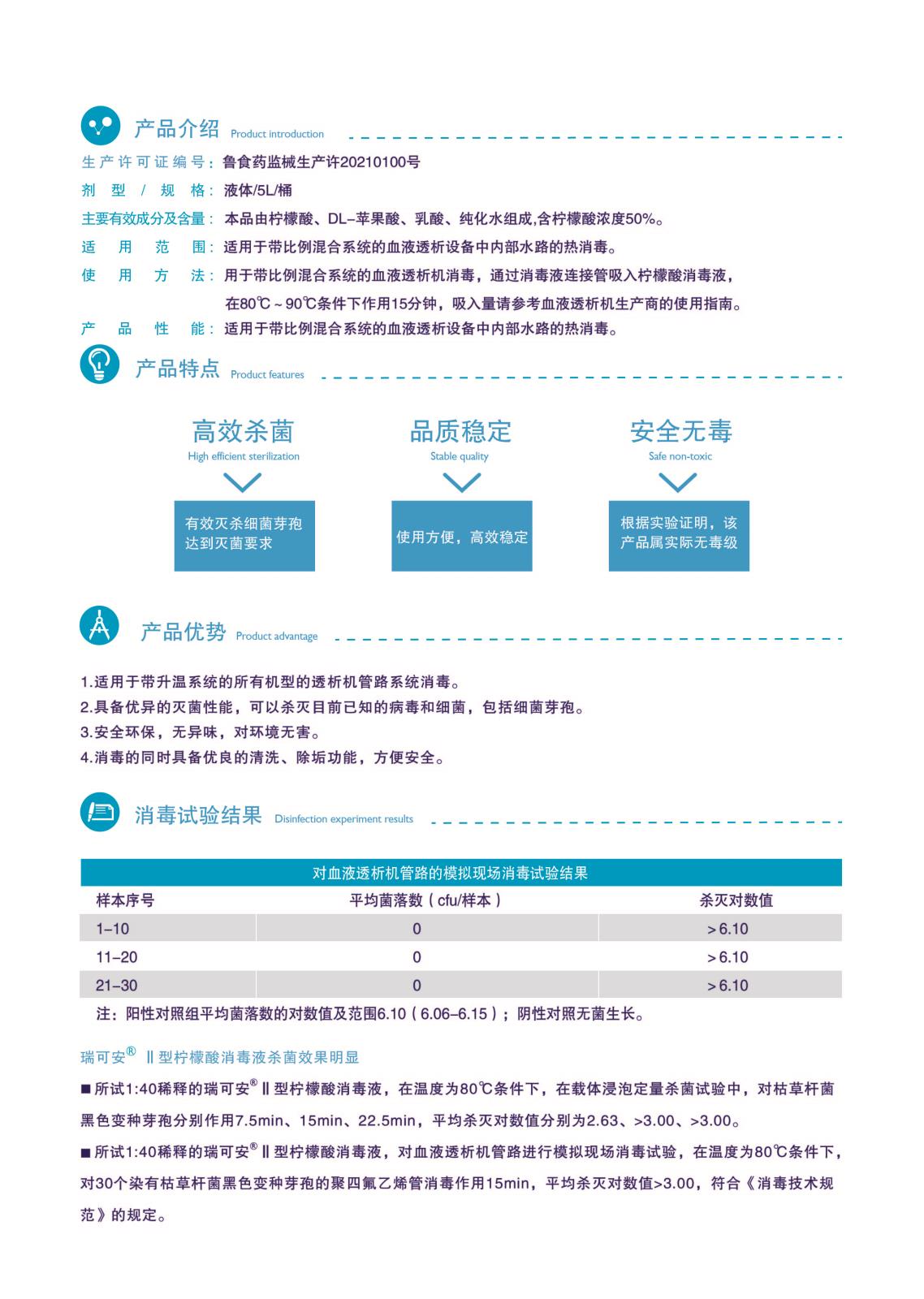 1.適用于能加溫至80℃-90℃的血透機(jī)管路消毒,根據(jù)血透機(jī)消毒程序自動按原藥:水稀釋比例為1:40,不需人工配制。
