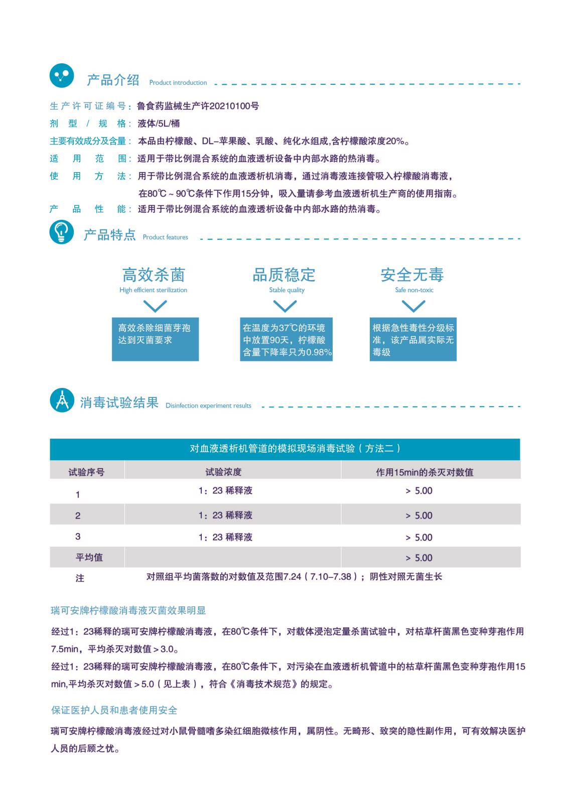 3.瑞可安檸檬酸消毒液含多種果酸、乳酸等成份,能有效解決血透機管路中消毒、除鈣、清理有機物沉淀等問題, 消毒的臨床效果優(yōu)于單一的檸檬酸消毒液。