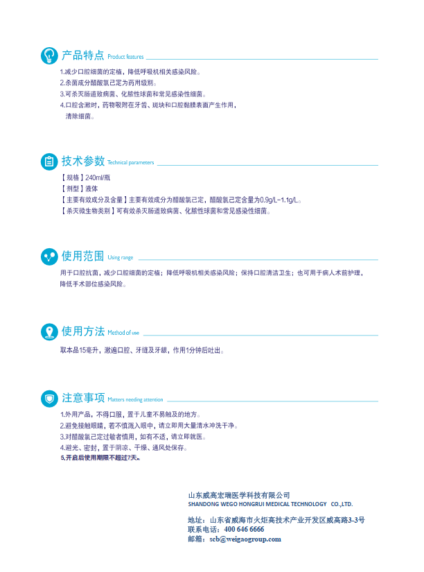 1.減少口腔細菌的定植,降低呼吸機相關(guān)感染風險。2.殺菌成分醋酸氯己定為藥用級別。3.可殺滅腸道致病菌、化膿性球菌和常見感染性細菌。4.口腔含漱時,藥物吸附在牙齒、斑塊和口腔黏膜表面產(chǎn)生作用,清除細菌。