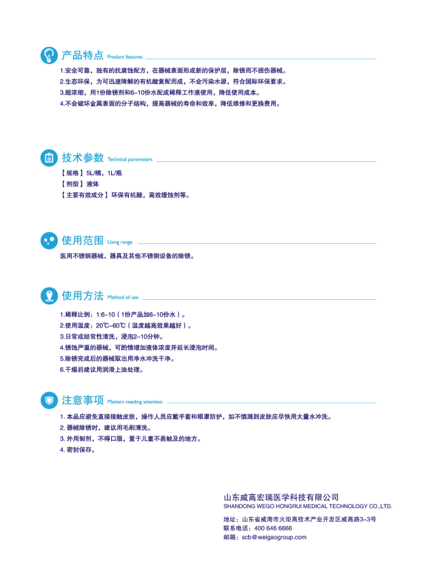 1. 安全可靠,獨(dú)有的抗腐蝕配方,在器械表面形成新的保護(hù)層,除銹而不損傷器械。